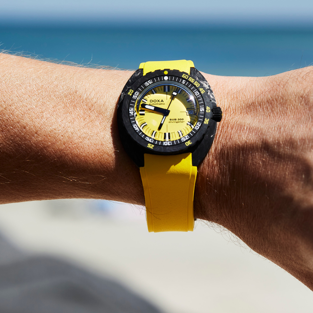 The SUB 300 in carbon is available in 8 colors with the choice of a rubber strap in black or in the same color as the dial. Featuring distinctive DOXA cues on both sides, the strap is fitted with a black PVD-treated folding clasp decorated with the exclusive DOXA fish symbol. It also has an adjustable diving extension to accommodate the thickness of a wetsuit.